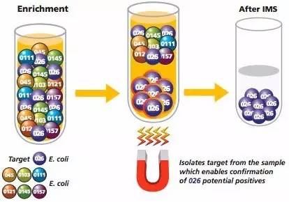 利用人工合成的內(nèi)含鐵成分,可被磁鐵磁力所吸引,外有功能基團(tuán),可結(jié)合活性蛋白質(zhì)(抗體)的磁珠,作為抗體的載體。當(dāng)吸附在磁珠上的抗體與相應(yīng)的微生物或特異性抗原物質(zhì)結(jié)合后,則形成“抗原-抗體-磁珠免疫復(fù)合物”,這種復(fù)合物具有較高的磁響應(yīng)性,在磁鐵磁力的作用下定向移動(dòng),使復(fù)合物與其他物質(zhì)分離,而達(dá)到分離、濃縮、純化微生物或特異性抗原物質(zhì)的目的。