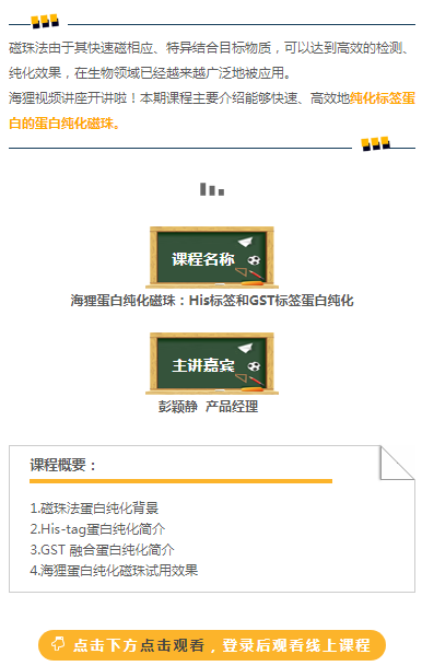 磁珠法由于其快速磁相應(yīng)、特異結(jié)合目標(biāo)物質(zhì),可以達到高效的檢測、純化效果,在生物領(lǐng)域已經(jīng)越來越廣泛地被應(yīng)用。 海貍首期直播課堂開課啦!本期課程主要介紹能夠快速、高效地純化標(biāo)簽蛋白的方法——磁珠法。
